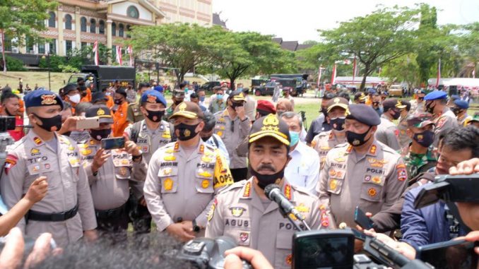 Pekanbaru – Kabaharkam Polri Komjen Pol Drs Agus Andrianto SH MH memimpin langsung Apel Kesiapsiagaan Satgas Relawan Karhutla dan Covid-19 bertempat di Lapangan Purna MTQ yang merupakan Posko Karhutla dan Covid-19 Provinsi Riau Jalan Jenderal Sudirman Pekanbaru, Kota Pekanbaru, Riau, pada Selasa (25/8).