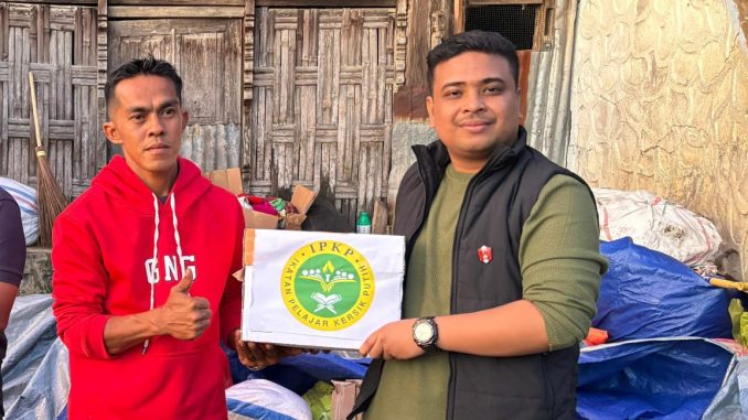 Bantuan yang di serahkan melalui demisioner ketua IPKP 2022 dan kolaborasi dengan organisasi Gerakan Mahasiswa Nasional Indonesia (GMNI) Cabang Bukittinggi.