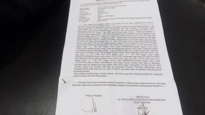 Urusan pascaperceraian antara Anita, Urusan pascaperceraian antara Anita Zumaroh dan Adik Triyanto masih belum mereda. Salah satunya, soal laporan Anita Zumaroh terkait dugaan penggelapan mobil jaz gono bininya ke Polres Banjarnagara pada 20 Oktober 2025, belum ditindak lanjuti.” Kita sudah laporan, terkait mobil jaz B 1801 EDM yang sudah dijual tak tahu rimbanya, polisi selayaknya menindaklanjuti, ” Lanjut Anita