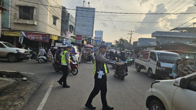 Untuk mengantisipasi terjadinya kemacetan, personel Satuan Lalu Lintas Polres Muara Enim tampak aktif melakukan pengaturan arus lalu lintas di berbagai titik persimpangan yang rawan terjadi kepadatan kendaraan.