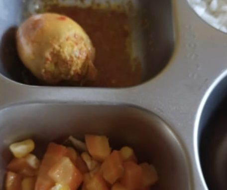 “Assalamu’alaikum, izin untuk menyampaikan, untuk sayur wortel sama jagung uda berbau juga uda berlendir. Mohon untuk diperhatikan lagi ini saya mencicipi porsi punya saya sendiri,” tulisnya.